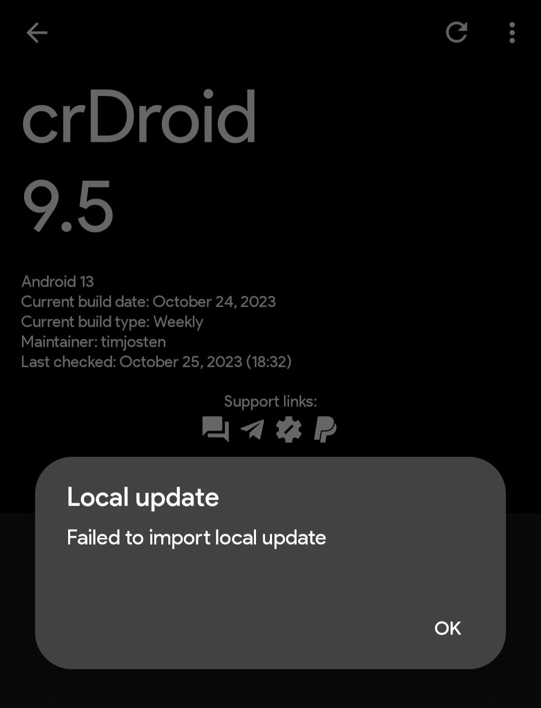 If you get this error "Failed to import local update", simply click on "OK" and then try to select the ROM for the second time using the "local update option". It should then import the downloaded ROM without any issues.