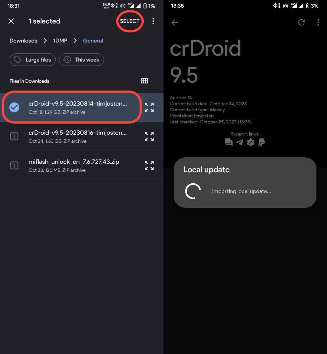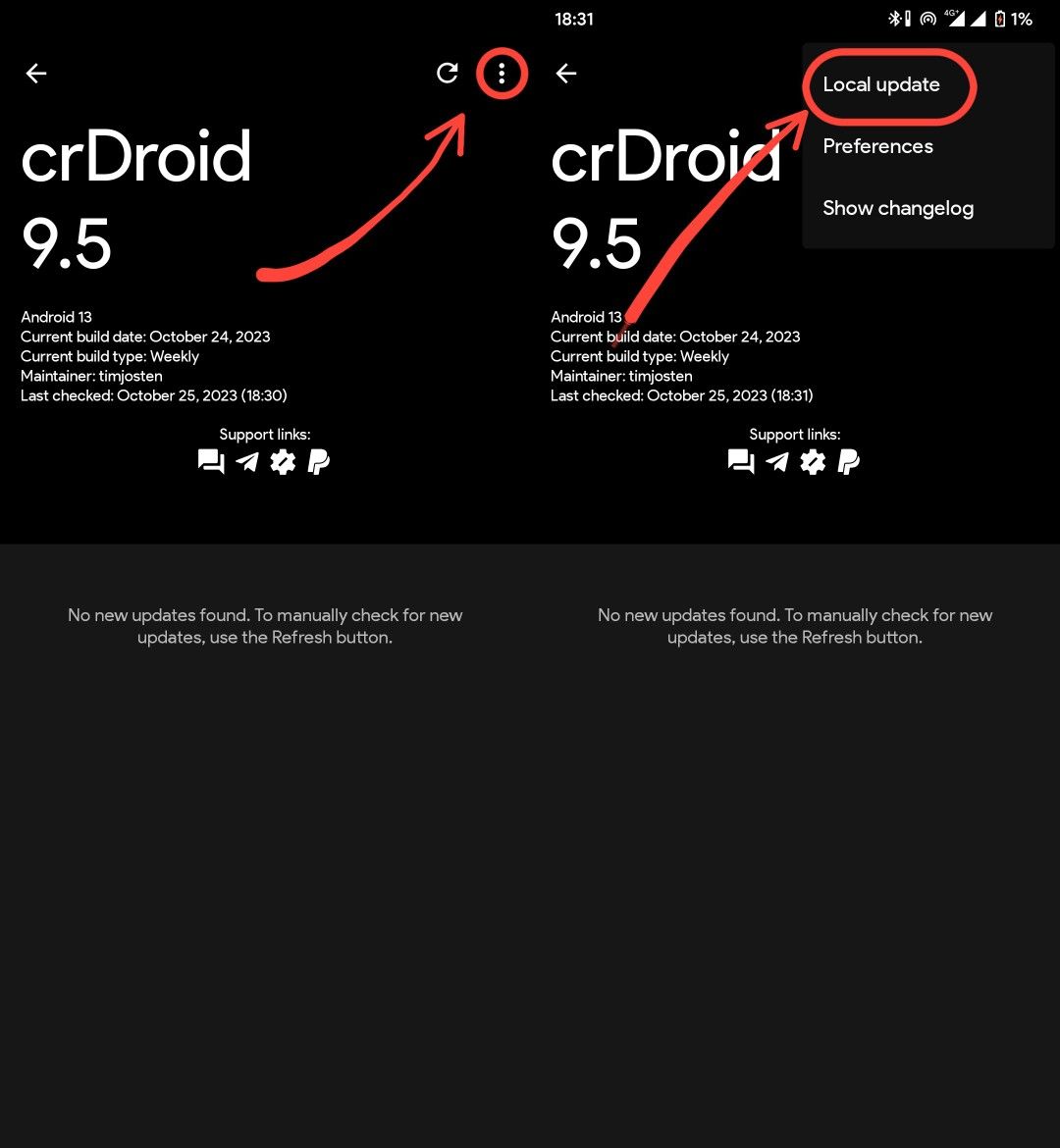 Download the Latest Update of the ROM from here and then navigate to OTA app via settings > System > Updater. Once you enter the OTA app, follow these instructions below: