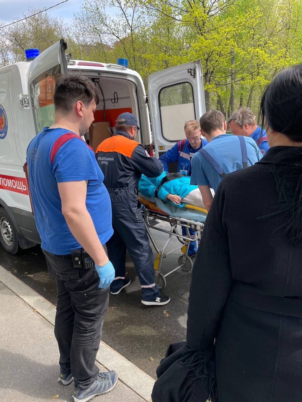 Не успели вернуться в расположение пришёл повторный вызов. Кошка сорвалась с 6-го этажа, забилась под машину. Аккуратно вытащили из под машины. Животное получило серьёзные травмы. Передали заявителям, нужно к ветеринару. Очень-очень жаль.