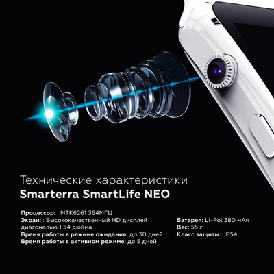 Smarterra SmartLife NEO экран: 1 .54 " (240x240) IPS • интерфейсы: Bluetooth 3 .0 • материал корпуса: пластик • звонки: собственная SIM-карта • мониторинг: физической активности, сна