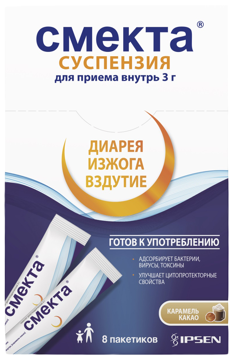 — Смекта, суспензия (карамель и какао), пакетики 3 г, 8 шт . Отложить Артикул: 207293 Смекта Производитель — Бофур Ипсен Индастри Форма выпуска — суспензия Действующее вещество — Смектит диоктаэдрический Количество — 8 Инструкция 325 руб . Много Купить Самовывоз из ближайшей аптеки Завтра - бесплатно