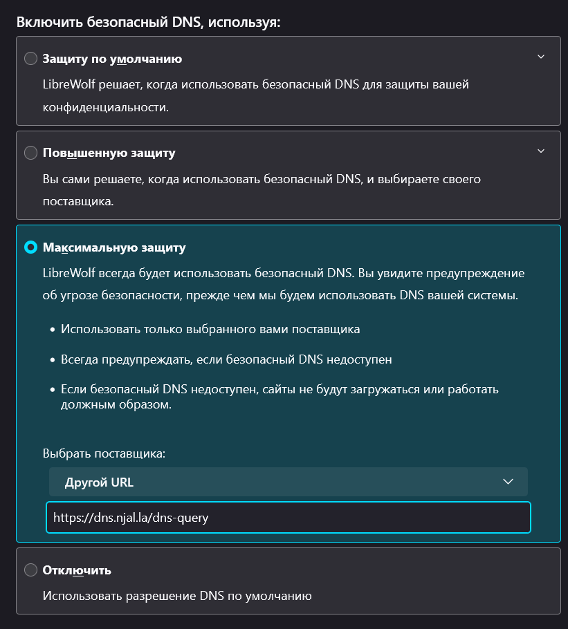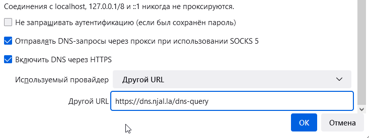4) Указываете в поле сервера от Njalla https://dns.njal.la/dns-query