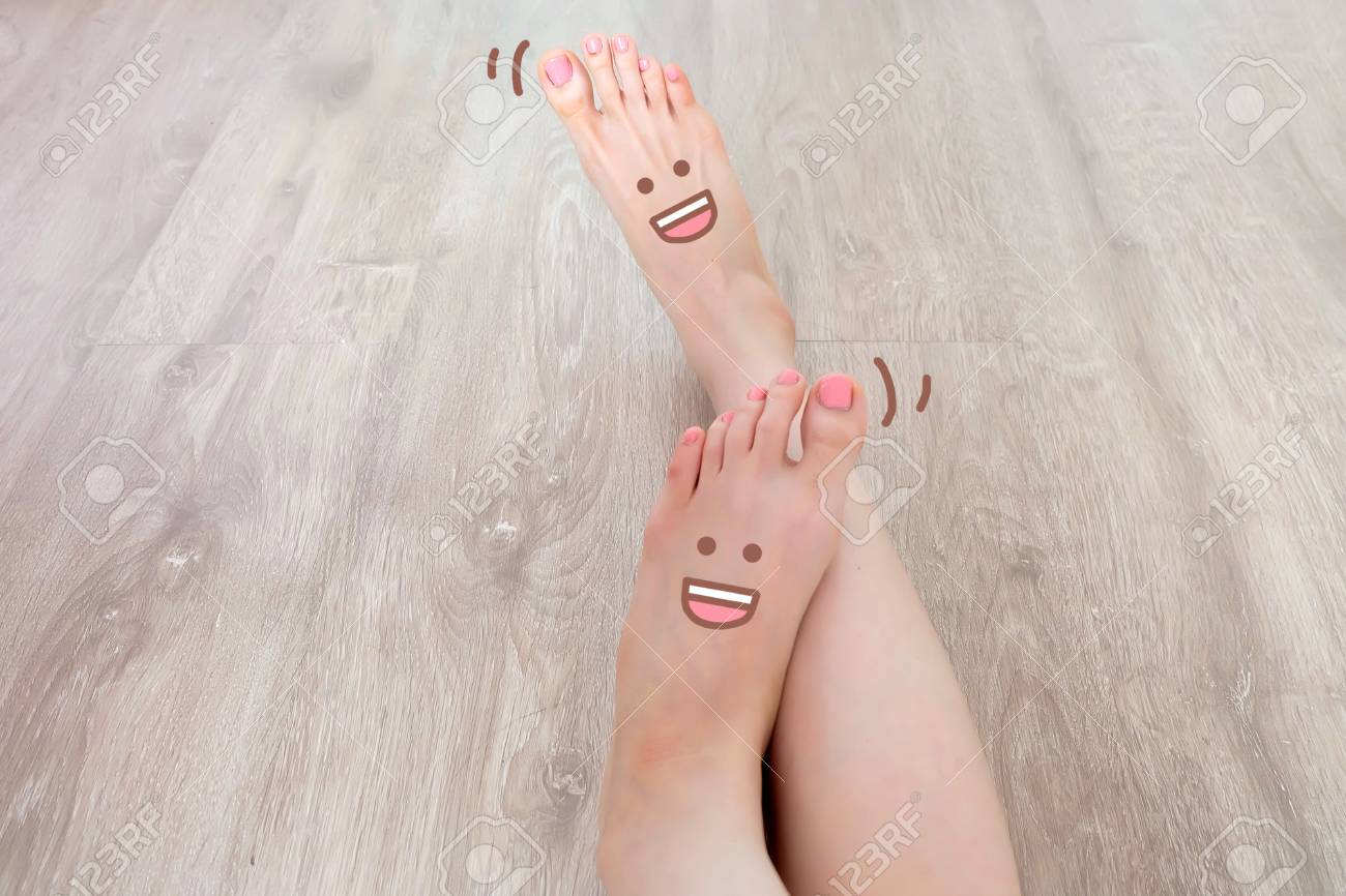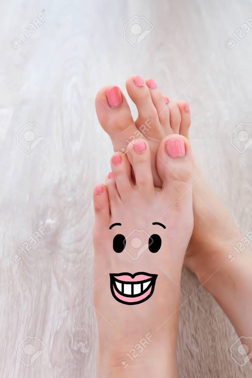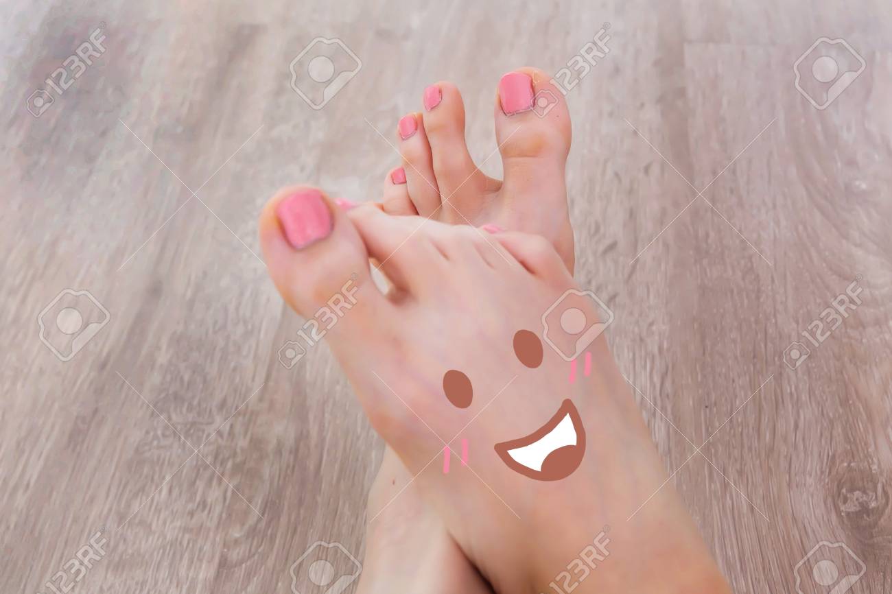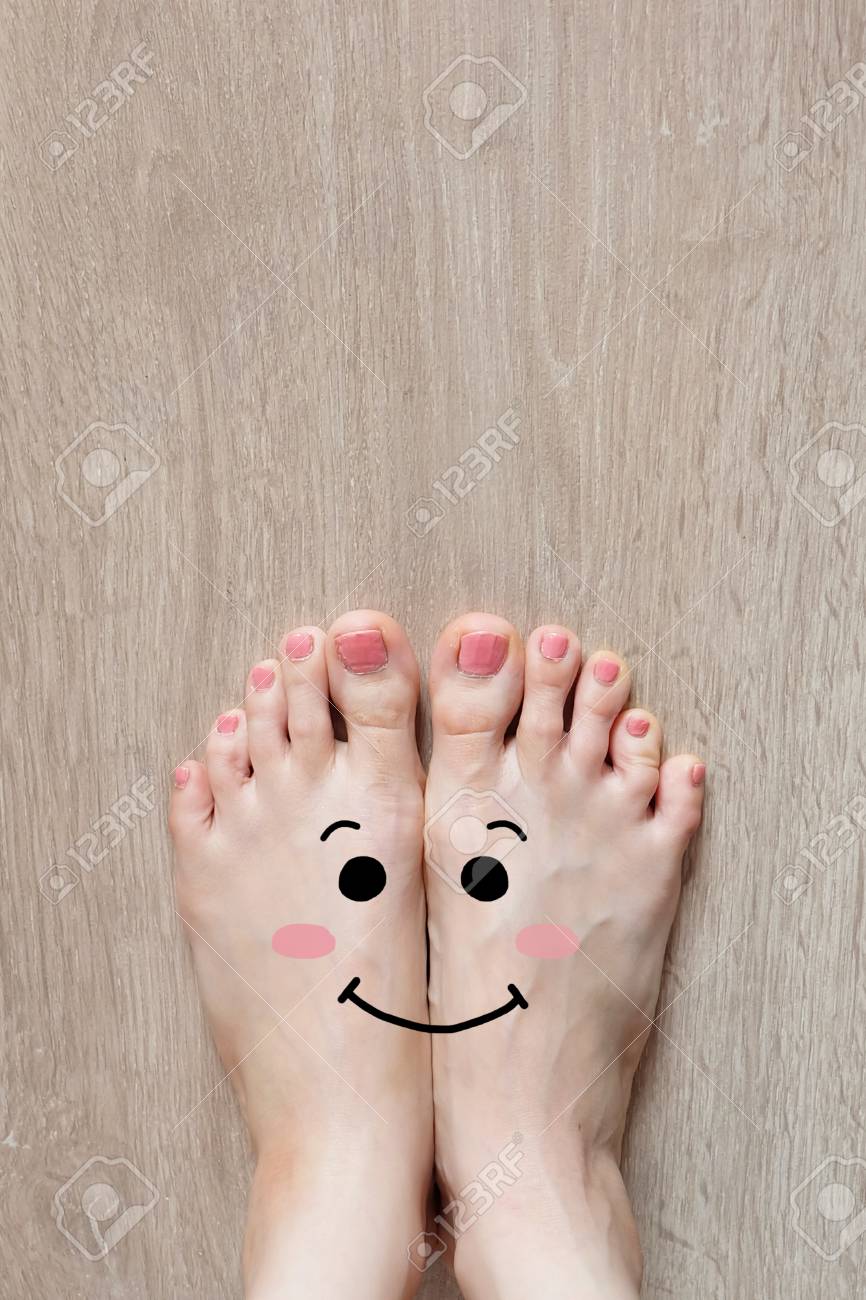 Smiley Face Drawn On Toes . Close Up Female Barefoot On . . .