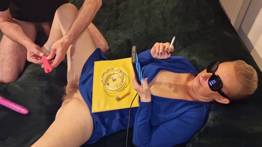 Smoking cigarette with vibrator pussy