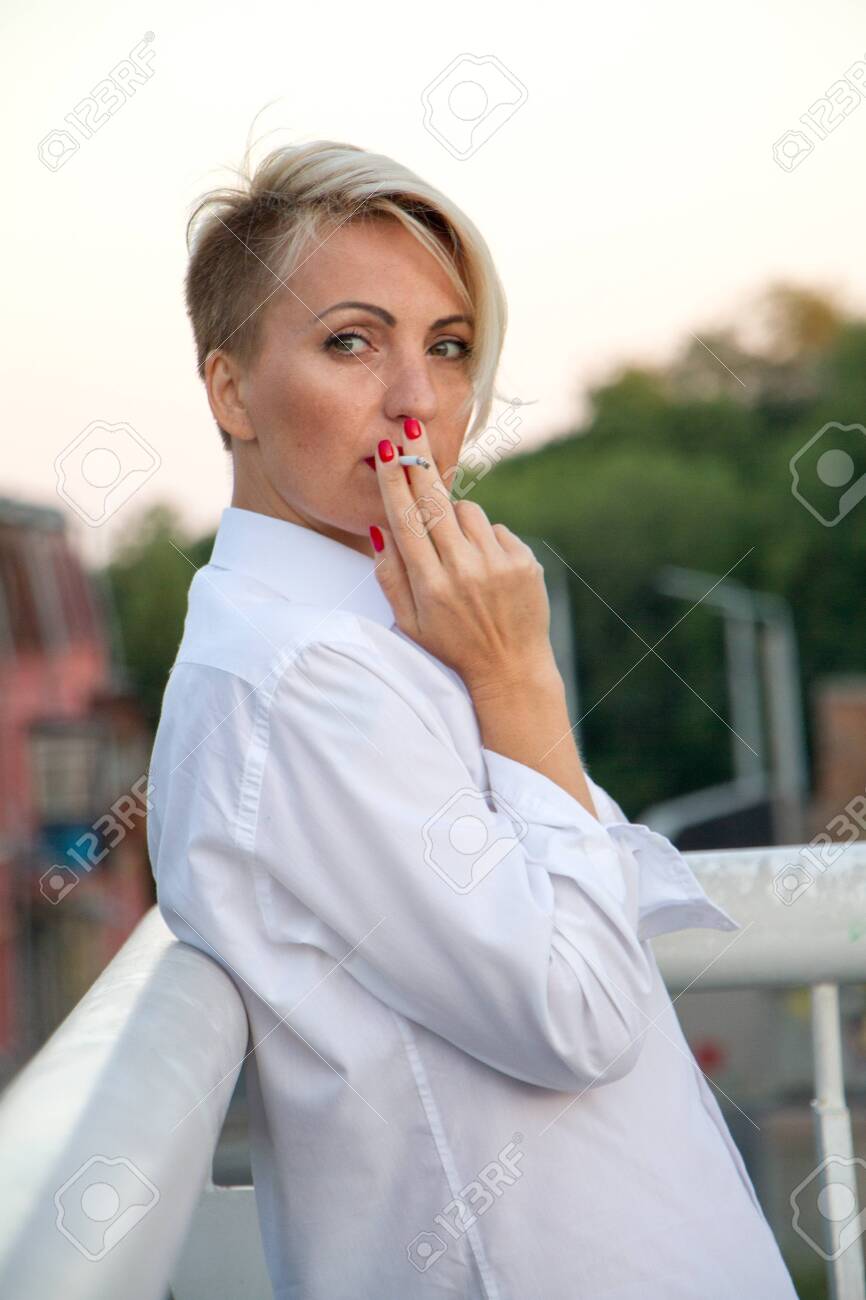 188 blonde smoking cigarette stock photos are available royalty-free . Reset All Filters . Young beautiful short hair blonde woman in black dress smoking a cigarette . Elegant romantic mysterious lady with movie star look . Red bricks wall on .