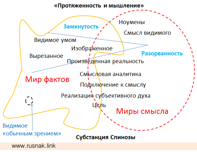 Отметим, что «фактологическую реализацию замысла» невозможно рассмотреть через простое наблюдение за несвязанными фактами. Так, рассматривая внешность человека, мы можем лишь предположить наличие духовного смысла за видимым. Таким образом, «увидеть» означает «воспроизвести замысел в себе» как результат восприятия определённых фактов. Это также подразумевает «множественность замыслов каждого реализующегося духа» и возможность их восприятия другими духовными субстанциями, но без возможности окончательного их воспроизведения (пульсация духа, пульсация смысла).