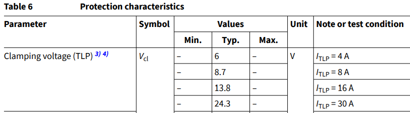 Это значит, что если ток будет продолжать течь или даже усиливаться, то Vh будет постепенно повышаться, пока не дойдет до Vcl. Если мы откроем таблицу значений Vcl для нашего Snapback диода, то увидим что оно варьируется от 1.9V до 24.3V в зависимости от тока. Как вы поняли, Vcl = 13V, это относительно номинальное значение, а не максимальное. Поэтому лучше всегда проверять его в даташите.