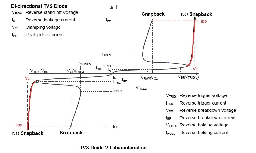 Для понимания принципа работы Snapback диода достаточно посмотреть на Рисунок 1, где показаны ВАХ обычного TVS и Snapback диодов. Сначала их характеристики не отличаются, но при достижения определенного уровня напряжения, они начинают вести себя по-разном.