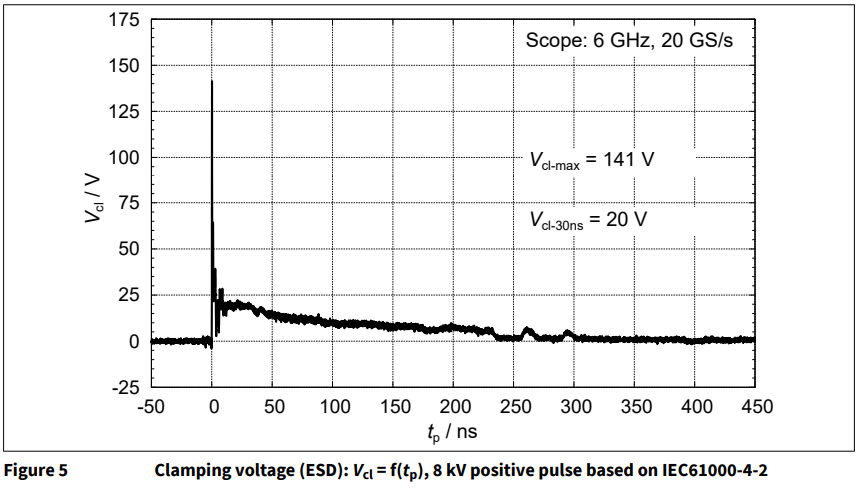 Как было написано выше, для подавления ESD импульса в обычных применениях могут подойти оба вида диодов. Сам импульс статического разряда имеет определенную фомру и она описана в стандартах. И важно понимать, что даже после срабатывания диода, напряжение не становится идеально ровным: короткий импульс в самом начале он всё-таки пропускает.