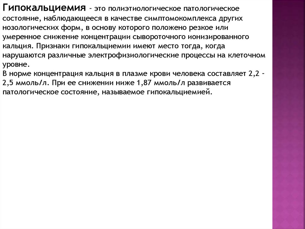 снижения уровня ионизированного кальция: первичный гипопаратиреоз (обе фракции кальция), псевдогипопаратиреоз, дефицит магния, витамина d; переливание цитратной крови, после больших травм, хирургических вмешательств, при сепсисе, ожогах, панкреатите, множественной недостаточности органов, после гемодиализа с применением диализата, содержащего …