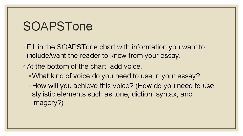 The SOAPSTone strategy may appear to be somewhat formulaic and rigid, but it helps students, especially novice writers, clarify and organize their thoughts prior to writing . It provides a specific structure for the text; by the time students have finished answering the SOAPSTone questions, they will have an outline of what they think, where . . .