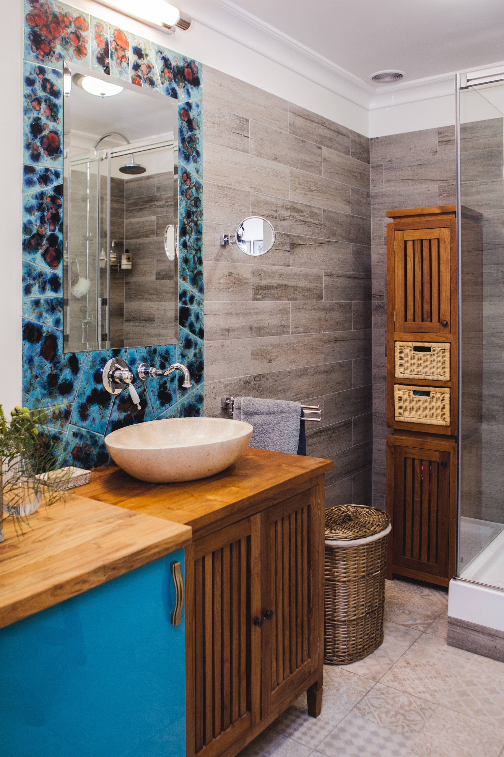 Сочетание дерева и плитки в ванной