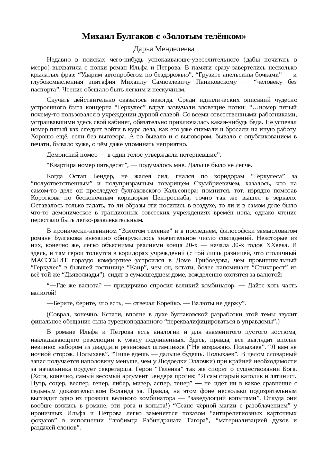 Михаил Булгаков с «Золотым телёнком» Дарья Менделеева Недавно в поисках чего-нибудь успокаивающе-увеселительного (дабы почитать в метро) выхватила с полки роман Ильфа и Петрова .
