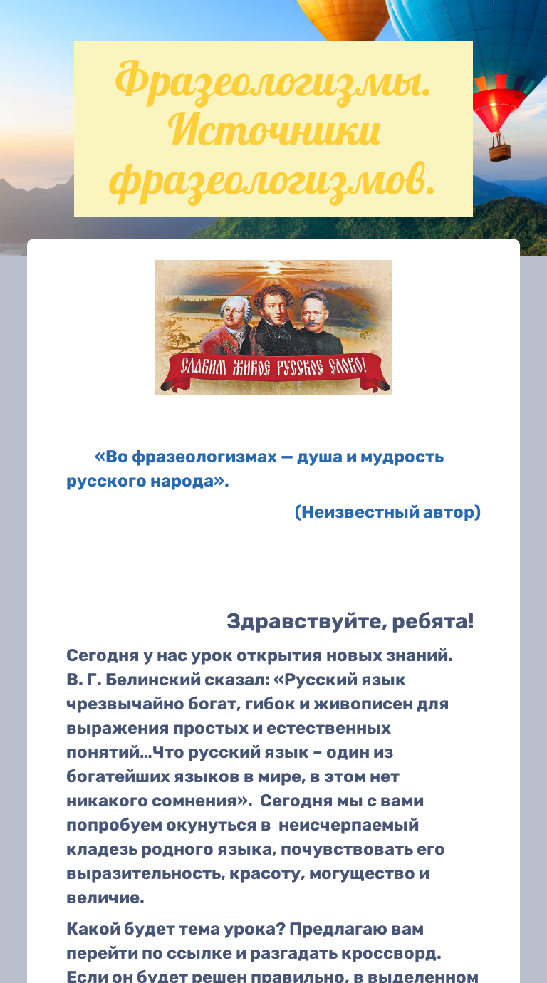 Доклад на тему Фразеологизмы 6, 7 класс . . . К сожалению, невозможно полностью узнать откуда появился тот или иной фразеологизм . Можно всего лишь предположить …