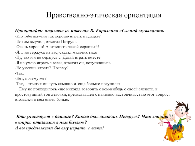 Здесь Вы можете ознакомиться и скачать Проблема нравственного выбора в повести В . Г . Короленко «Слепой музыкант» . Если материал и наш сайт сочинений Вам понравились - поделитесь им с друзьями с помощью социальных кнопок! Сочинения» По авторам» Короленко В .Г .» Проблема . . .