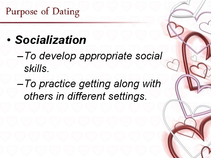 Social Skills . FRIENDSHIP AND DATING SKILLS . Expressing Positive Feelings . Giving Compliments . Accepting Compliments . Finding Common Interests . Asking Someone for a Date . Ending a Date . Expressing Affection . Refusing Unwanted Sexual Advances . Requesting That Your Partner Use a Condom . Refusing Pressure to Engage in High-Risk Sexual Behavior