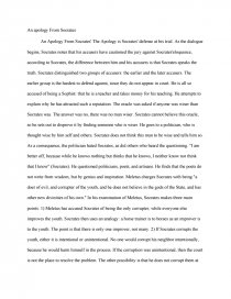view essay example . Plato Socrates The Apology 2 Pages . Apology, written by Plato, outlines what occurred during Socrates' trial . Socrates was on trial because he was accused of being a doer of evil, corrupter of the youth, and not believing in the gods . His charges where those often used against philosophers .