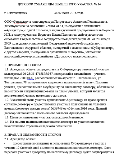 Соглашение на субаренду