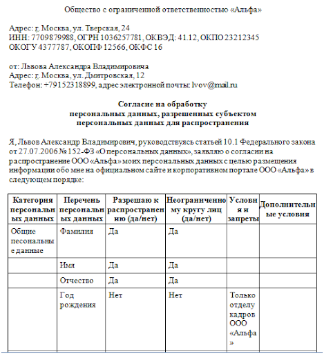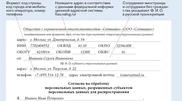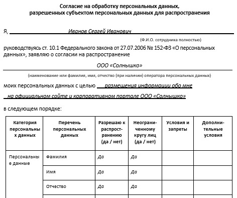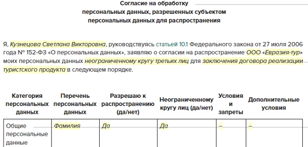 Согласие на распространение пд