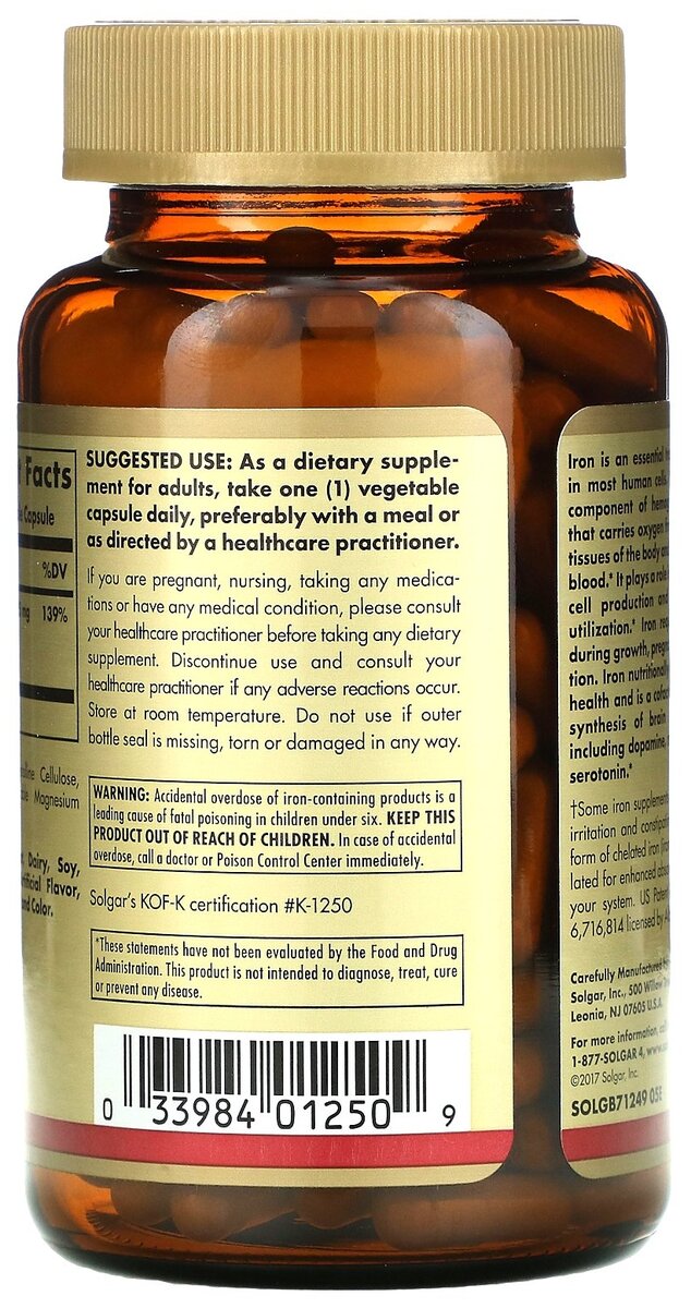 Инструкция по применению Солгар Легкодоступное железо Джентл Айрон: способ и дозировка БАД принимают перорально . Взрослым назначают 1 раз в сутки по 1 капсуле во время приема пищи . Рекомендуемая дозировка обеспечивает 140% суточной потребности в железе для женщин и 250% - для мужчин .