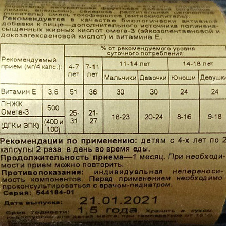 Капсулы «Золотые рыбки» от Солгар предназначены для детей . Препарат назначается в качестве пищевой добавки . Суточная норма ДГК+ЭПК для малышей - 100 мг, для детей в возрасте от 2 лет - 120-150, от 4 - 150-200, от 6 - 200-250 . Подросткам от 10 до 18 лет рекомендуется принимать по 250 мг в день . Ограничения