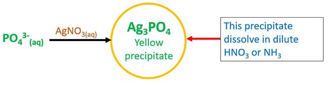 Раствор нитрата серебра и фосфат-иона реагируют с образованием фосфата серебра (Ag3PO4) в виде желтого осадка. Этот осадок растворяется в разбавленной азотной кислоте HNO3 или растворах аммиака.