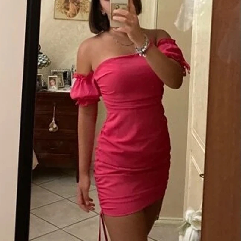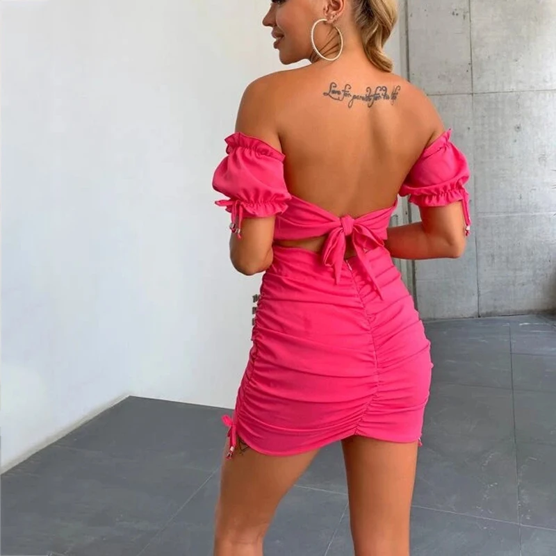 Solid Color Ruched Polyester Women Bow Tie Off Shoulder Date Bodycon Rose Mini Dresses Drawstring Backless Sexy Party Vestidos - Купить с бесплатной доставкой