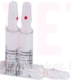 Солидаго композитум С . Производитель . Биологише Хайльмиттель Хеель ГмбХ, Германия . Biologische Heilmittel Heel GmbH, Dr-Reckeweg-Str 2-4, 76532 Baden-Baden, Germany . Описание лекарственной формы Раствор для внутримышечного введения гомеопатический . Состав (на одну ампулу 2,2 мл (=2,2 г)) .