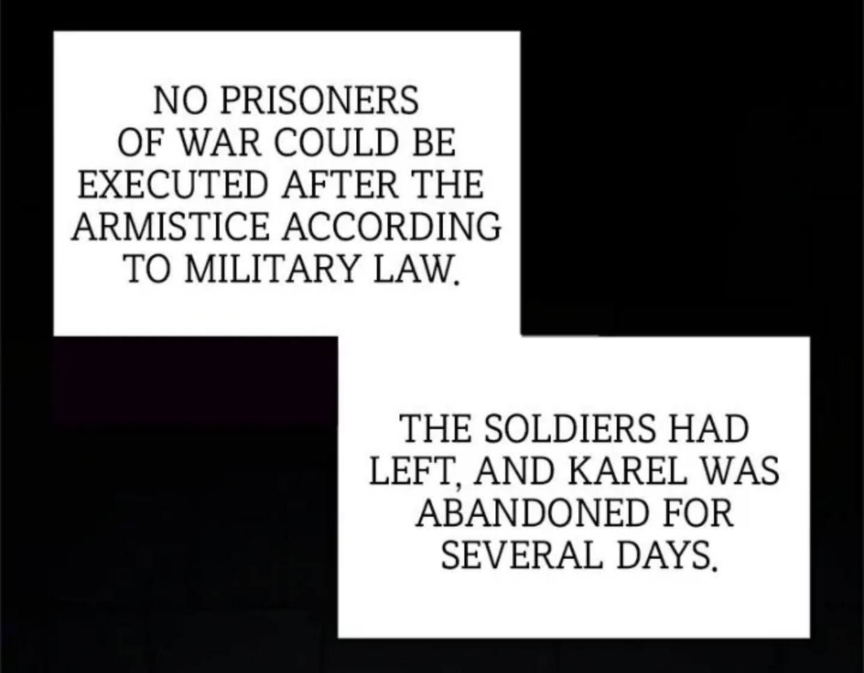 / В соответствии с военным законодательством, военнопленные не могут быть казнены после объявления о перемирии. Солдаты ушли, и Карел был брошен и забыт на несколько дней./