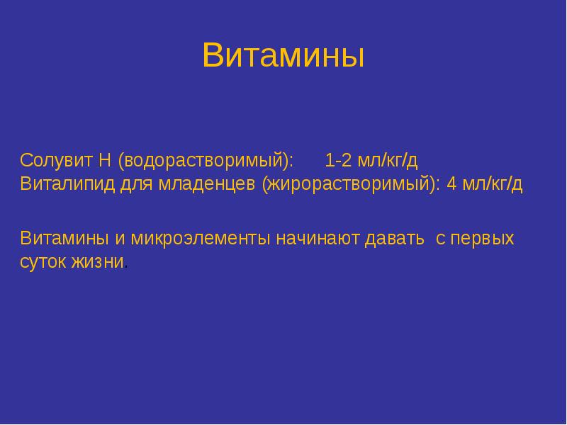 Солувит Н можно добавлять к смесям для парентерального питания, богатых углеводами, липидами, аминокислотами, электролитами и микроэлементами, при условии, что совместимость и стабильность была подтверждена .