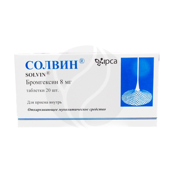 Торговое название: Солвин (Solvin) Международное непатентованное название: Бромгексин (Bromhcxine) Лекарственная форма: таблетки по 8 мг и эликсир 4 мг/5мл . Состав: Каждая таблетка содержит: бромгексина гидрохлорид 8 мг . и вспомогательные вещества: лактоза,