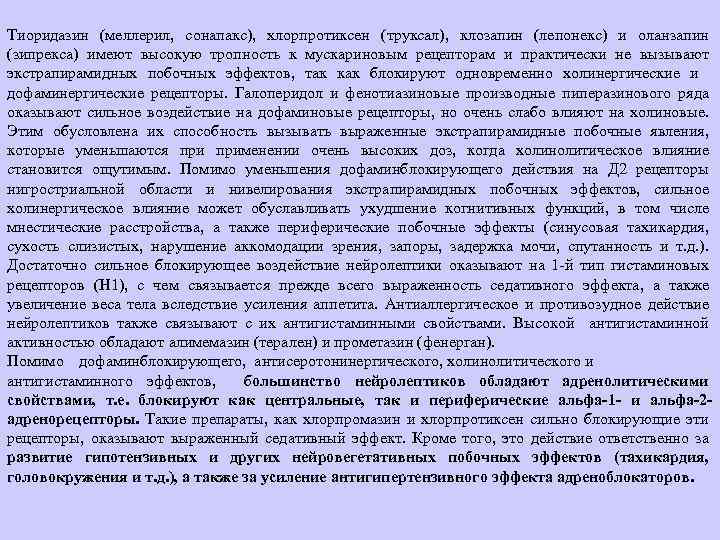 Сонапакс, неулептил, хлорпротиксен . Немного тоже помогало . Далее (и далее внимательнее) бросил пить хлорпротиксен, так как от него глаза закрывались и начал пить галоперидол в дозе 5 мг в сутки на протяжении 5 ти лет . . .