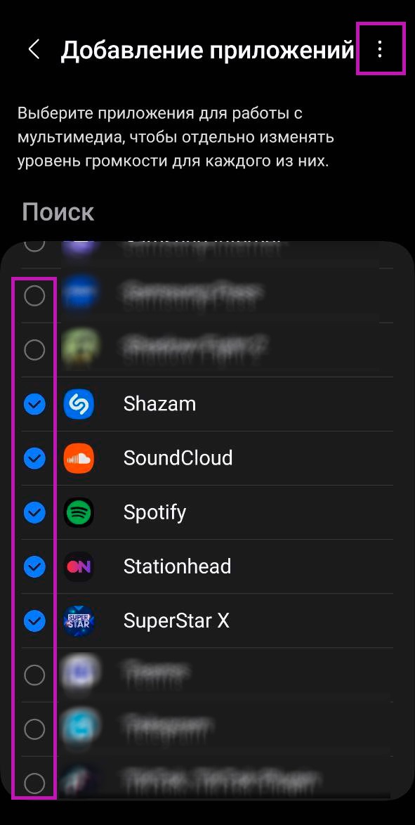 Выбираем приложения для которых хотим настроить отдельный уровень громкости. Затем жмякаем на три точки в верхнем правом углу