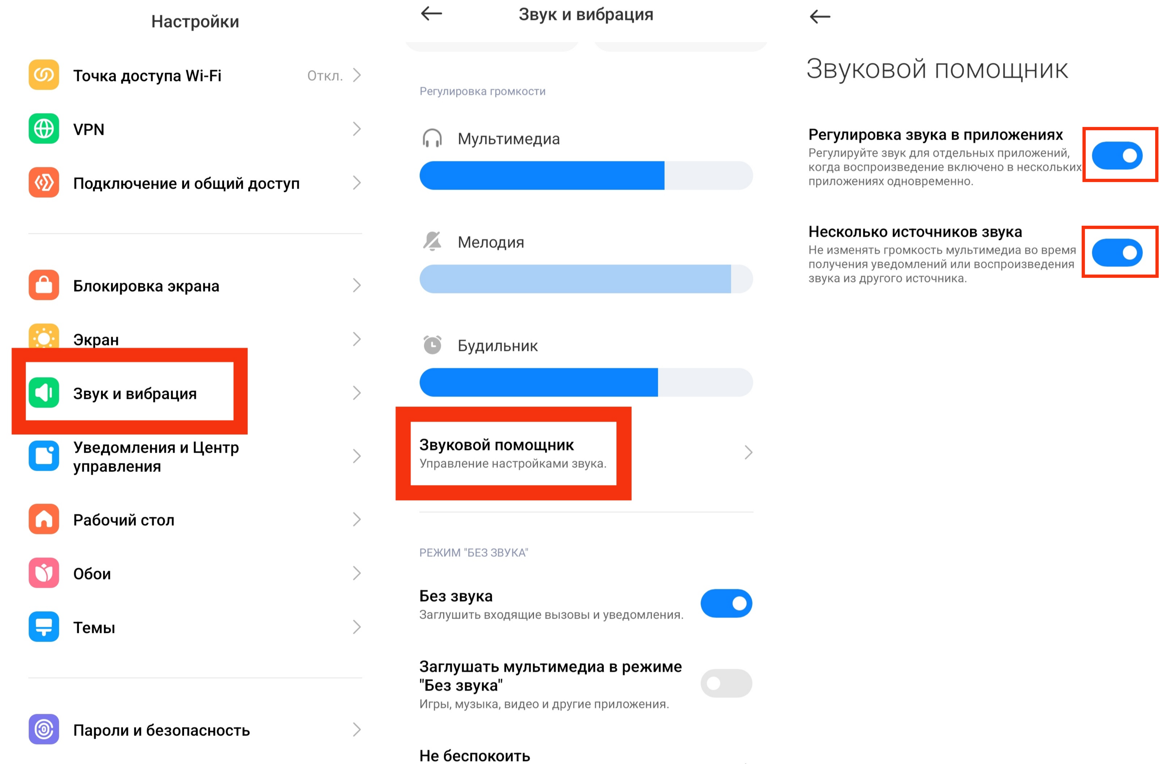У некоторых андроид устройств есть инструменты для многоканального воспроизведения и регулирования громкости звука, аналогичные таковым на компьютере. Вы можете поискать подобные параметры в настройках звука своего телефона. Мы же опишем два варианта: внутренние настройки звука (Xiaomi MIUI 12+) и приложение Sound Assistant (Samsung Galaxy 7+).
