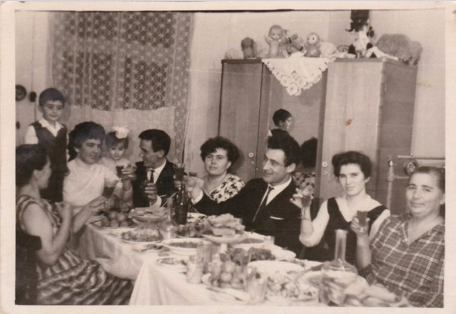 Советское застолье разных лет . Стол с простенькой посудой и щедрым по тем временам угощением, много людей за столом, тесно, все сидят плечом к плечу — ничего, в тесноте, да не в обиде . . .