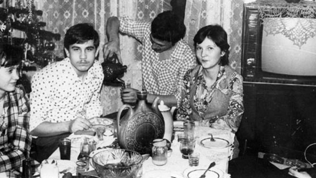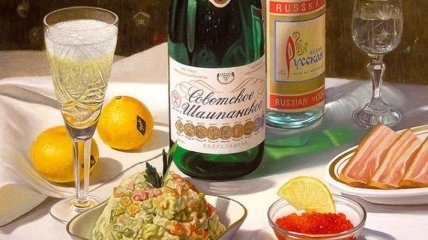 Образцовое советское застолье на Новый год включало блюда, которые готовили все: оливье, селедка под шубой, жареная курица, шампанское и бутерброды со шпротами .