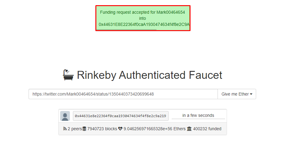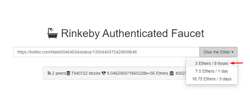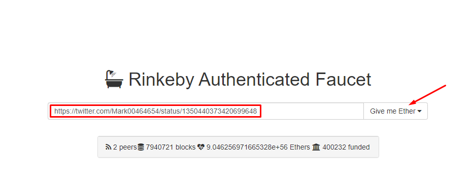 Копируем ссылку на ваш твит , и переходим на сайт - https://faucet.rinkeby.io/