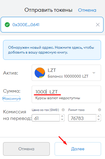 Для теста можем отправить на другой адрес ваши токены