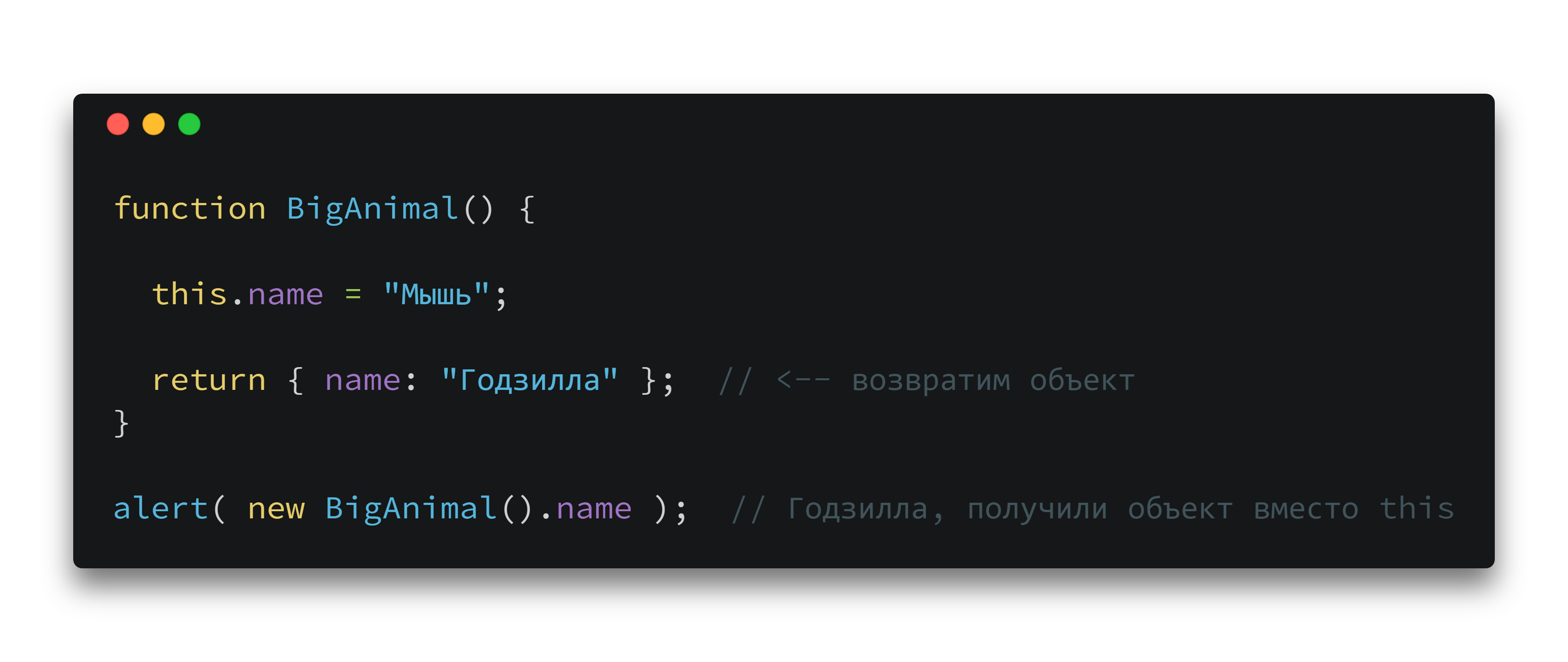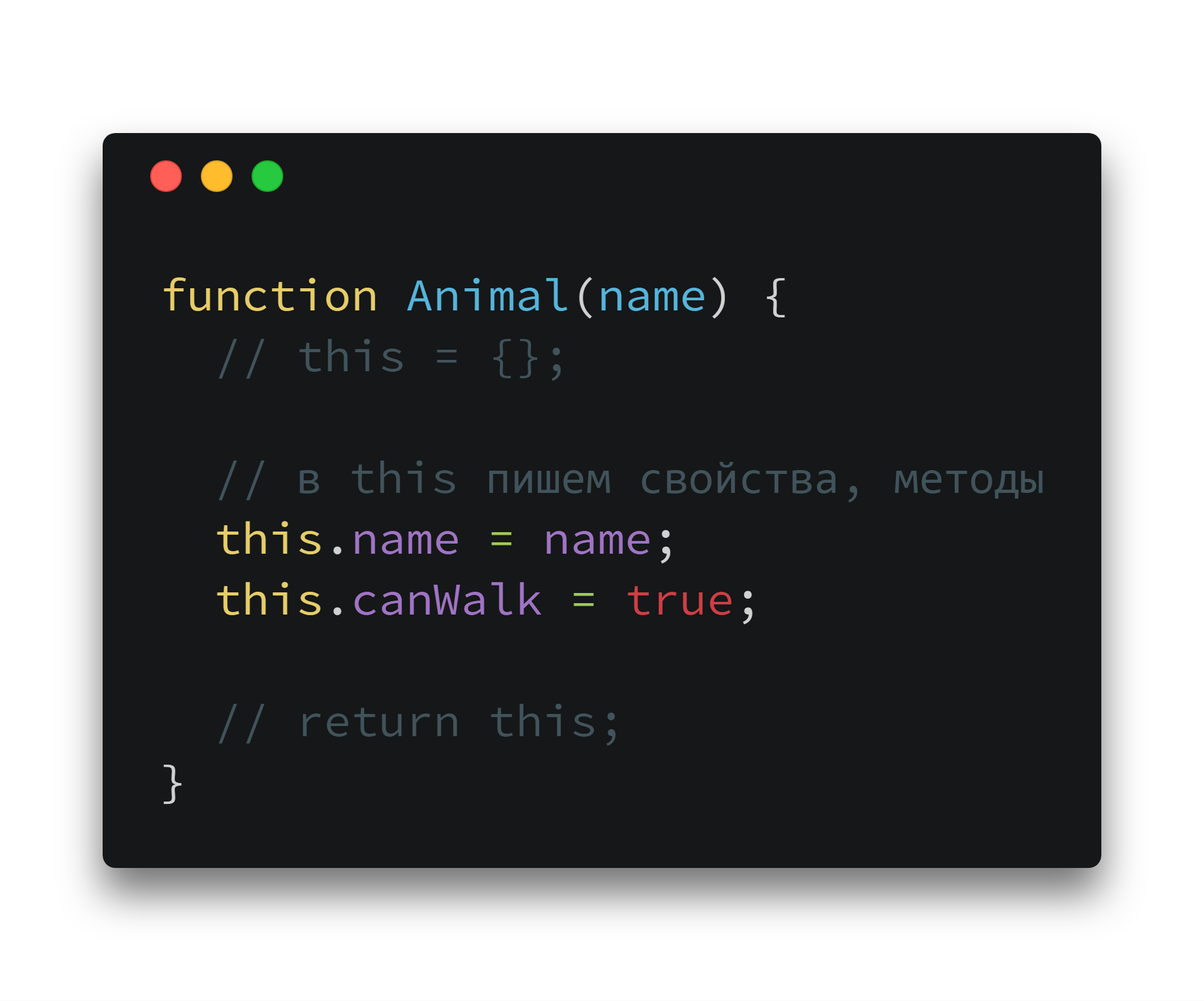 Но, чтобы выделить функции, задуманные как конструкторы, их называют с большой буквы: Animal, а не animal.