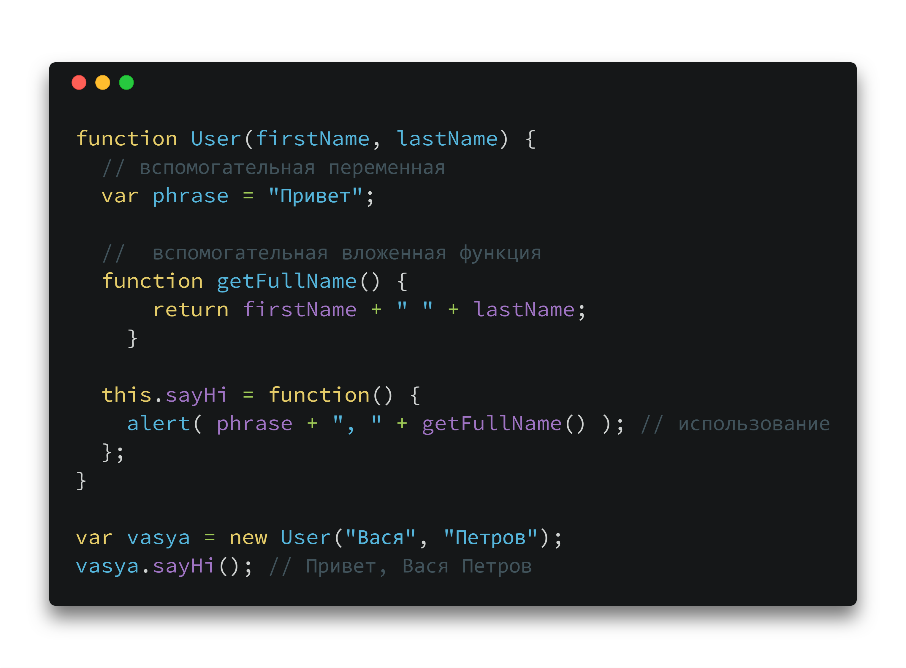 Те функции и данные, которые должны быть доступны для внешнего кода, мы пишем в this – и к ним можно будет обращаться, как например vasya.sayHi(), а вспомогательные, которые нужны только внутри самого объекта, сохраняем в локальной области видимости.