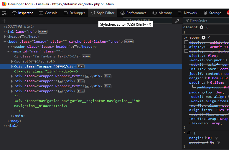 - Там у нас открывается DevTools в котором мы выбираем Style Editor