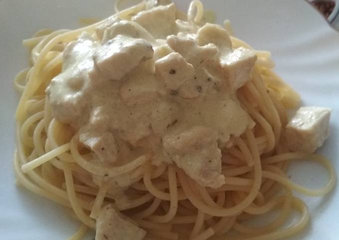 Рецепт: Спагетти с курицей и грибами, в сливочном соусе на . . .