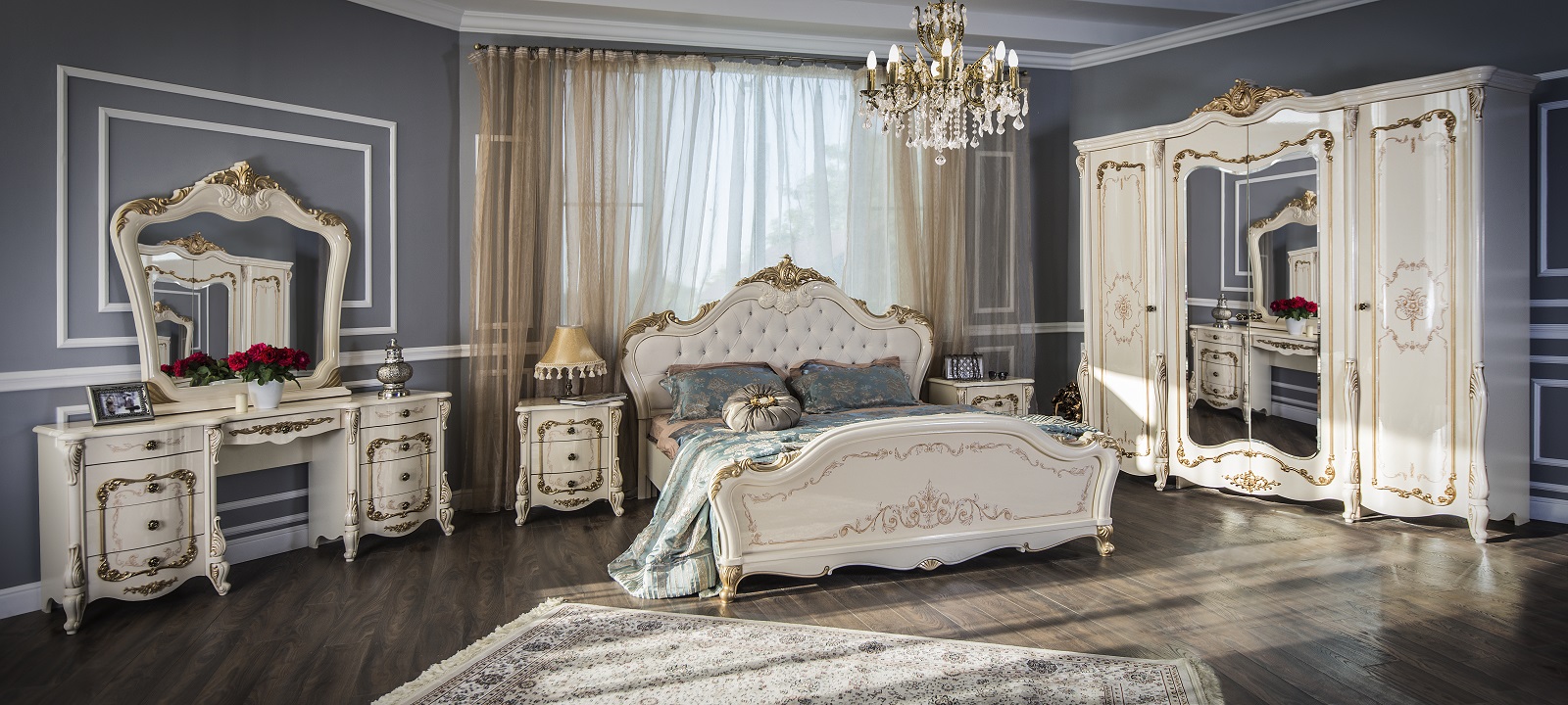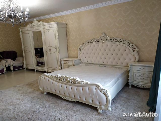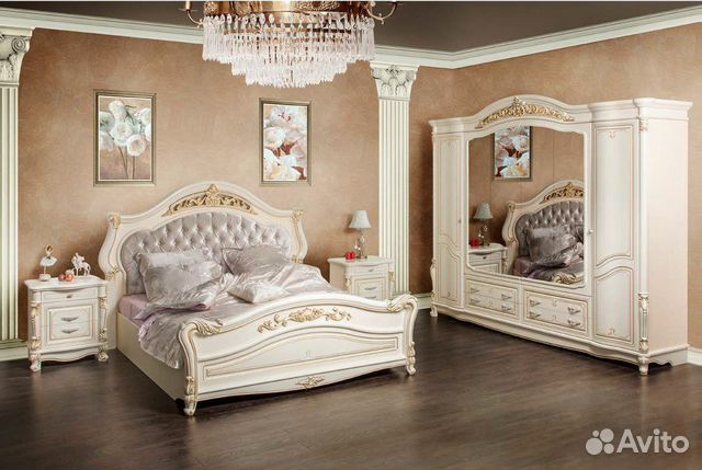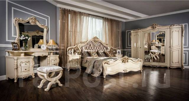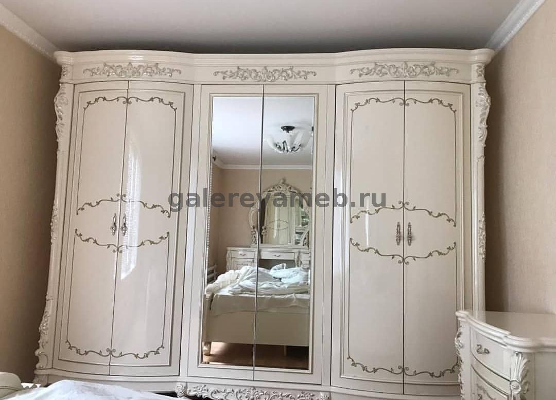 Каталог с фото, описанием и ценами . Доставка! 8 (495) 970-33-09 . г . Москва . . . Спальни Ставрополь . . . . Спальня Версаль с 6-ти дверным шкафом (с короной) слоновая кость мягкое изголовье . . .