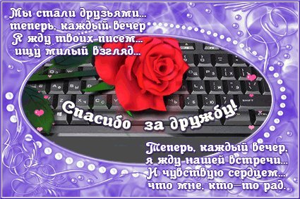 Открытки спасибо за дружбу . Сайт открыток greet4you .ru содержит красивые поздравительные открытки на различные праздники и случаи жизни . Вы абсолютно бесплатно можете скачать, отправить или сохранить любую открытку, чтобы подарить её в социальных сетях . . .