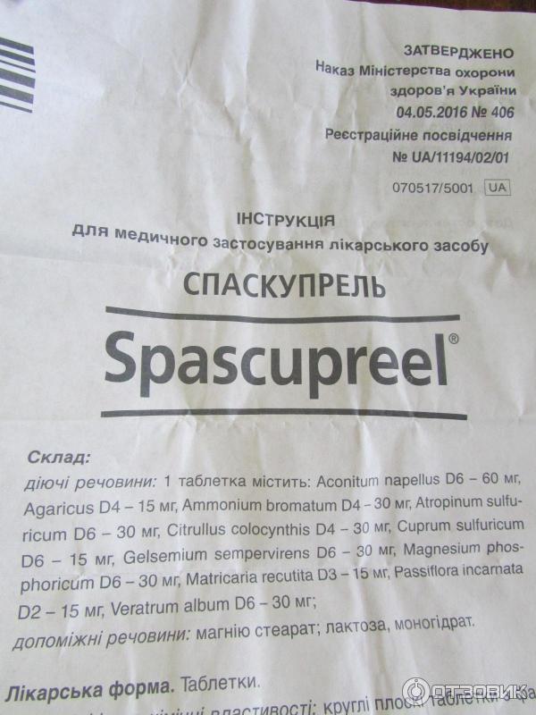 Сублингвально, по 1 таблетке Спаскупреля 3 раза в день . Фармакологическое действие Гомеопатический препарат, действие которого обусловлено входящими в его состав компонентами . Побочные действия Аллергические реакции на компоненты Спаскупреля . Особые указания Особых указаний при применении Спаскупреля не описано . Взаимодействие