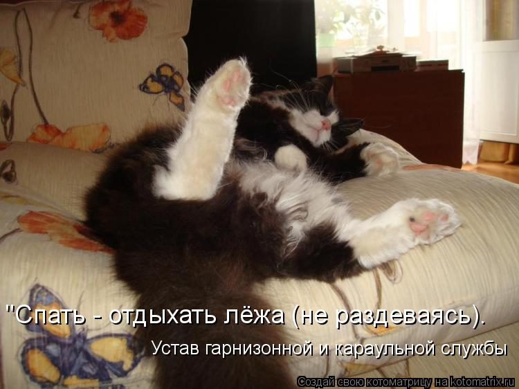 и два часа в отдыхающей смене - спать не раздеваясь, но можно разуться Устав Внутренней службы гласил :"Караульному отдыхающей смены разрешается отдыхать лежа (спать) не снимая сапог и снаряжения "