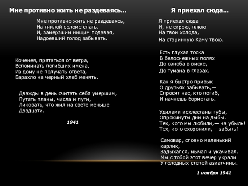 Мне противно жить не раздеваясь, На гнилой соломе спать . И, замерзшим нищим подавая, Надоевший голод забывать . Коченея, прятаться от ветра, Вспоминать погибших имена, Из дому не получать ответа, Барахло на
