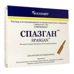 Спазган в виде раствора для внутривенного (в/в) и внутримышечного (в/м) введения реализуется в ампулах объемом по 5 мл, запакованных в контурные ячейковые упаковки по 5 ампул . Фармакологическое действие Анальгезирующее, обезболивающее, жаропонижающее, спазмолитическое . Фармакодинамика и фармакокинетика