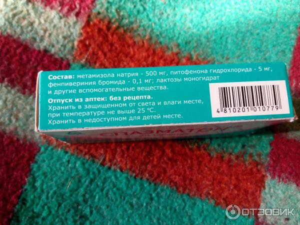 Спазматон : инструкция по применению . одна таблетка содержит: действующие вещества - метамизола натрия - 500 мг, питофенона гидрохлорида - 5 мг, фенпивериния бромида - 0,1 мг; вспомогательные вещества - лактозы . . .