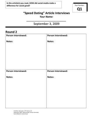Speed dating originated in 1998 as an efficient way for prospective romantic partners to meet each other (Deyo & Deyo, 2003); however, the method was co-opted by the educational world and adapted for the classroom in 2005 (Muurlink & Matas, 2011) . In an educational setting, speed dating consists of a series of brief one-on-one interactions between students (Murphy, 2005; Muurlink & Matas, 2011) .
